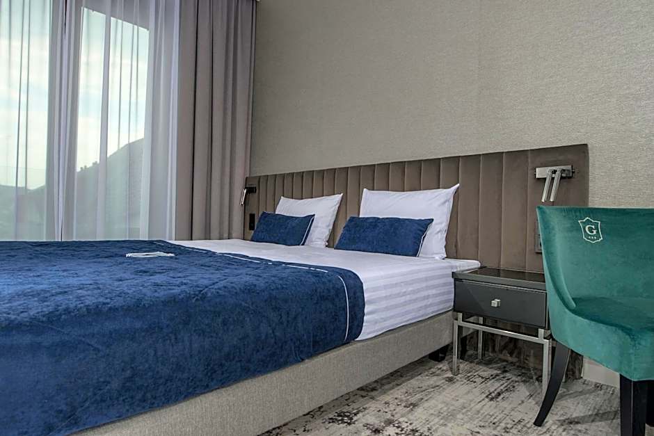 This room is located on the ground floor with views of the fountain, and has a seating area with a sofa bed.